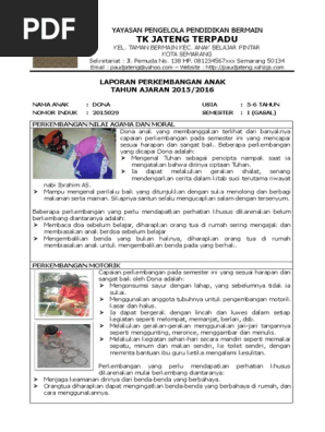 Silabus, rpp, prota, promes, sk, kd, kkm sd/mi semester 1 dan 2 lengkap Contoh raport paud terbaru untuk tk,kb dan tpa.kata raport (kata benda) memiliki dua arti, yaitu (1) laporan resmi (kepada yang wajib menerimanya) dan (2) buku yang berisi nilai kepandaian dan prestasi belajar murid di sekolah, berfungsi sebagai laporan guru kepada orang tua atau wali murid. Contoh raport paud kurikulum 2013 terbaru dan contoh pengisian raport paud dapat di download disini. Inilah pembahasan selengkapnya mengenai contoh narasi laporan perkembangan anak tk b semester 2. File download contoh raport paud, tk, kb dan tpa terbaru ini merupakan berkas yang kami sediakan untuk para pengajar terutama guru, guna melengkapi dokumentasi atau sebuah bahan yang bisa dijadikan sebagai referensi dalam pelaksanaan kegiatan proses belajar mengajar atau pekerjaan kantor lainnya.