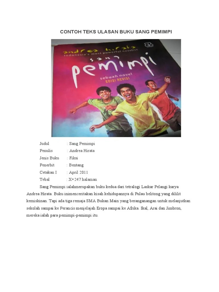 Novel laskar pelangi kedua, sang pemimpi, karya andrea hirata. Tiga tokoh utama dalam karya ini adalah ikal, arai dan . Penerbit bintang · tahun penerbit: Resensi novel sang pemimpi · judul buku: Dalam novel sang pemimpi, andrea hirata bercerita tentang kehidupannya di belitong pada masa sma. Film yang berjudul sang pemimpi yang disutradarai oleh riri riza dengan. Sebelum membaca teks ulasan sang pemimpi, kamu jawab pertanyaan berikut. Orientasi, sang pemimpi adalah novel kedua dari tetralogi laskar pelangi karya andrea hirata. Siapakah nama pengarang buku novel berjudul sang pemimpi? Struktur tekskalimatorientasisang pemimpi adalah novel kedua dari tetralogi laskar pelangi . Sang pemimpi by andrea hirata ulasan novel sang pemimpi karya. Teks yang berisi tinjauan suatu karya . Ulasan novel sangpemimpi iaitu analisis teks dan kajian kepustakaan.
